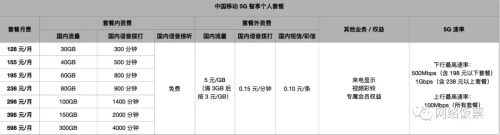 限速方面,中国移动5G套餐以298元套餐为区分,128元/198元套餐最高速率为500Mbps,298元套餐及以上最高速率为1Gbps。