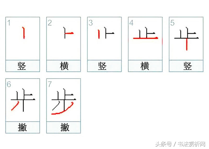 笔顺: 竖 横 竖 横 竖 撇 撇。丨一丨一丨ノノ