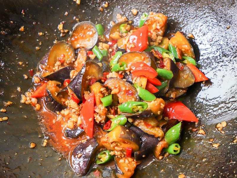 加入鸡粉1克、胡椒粉1克、白糖少许提鲜、生抽10克搅拌均匀,倒入准备好的茄子,用小火焖2分钟,倒入切好的青红椒翻炒至断生,勾入少许水淀粉把汤汁收浓,再淋入少许明油提亮色泽,翻匀后即可出锅装盘。