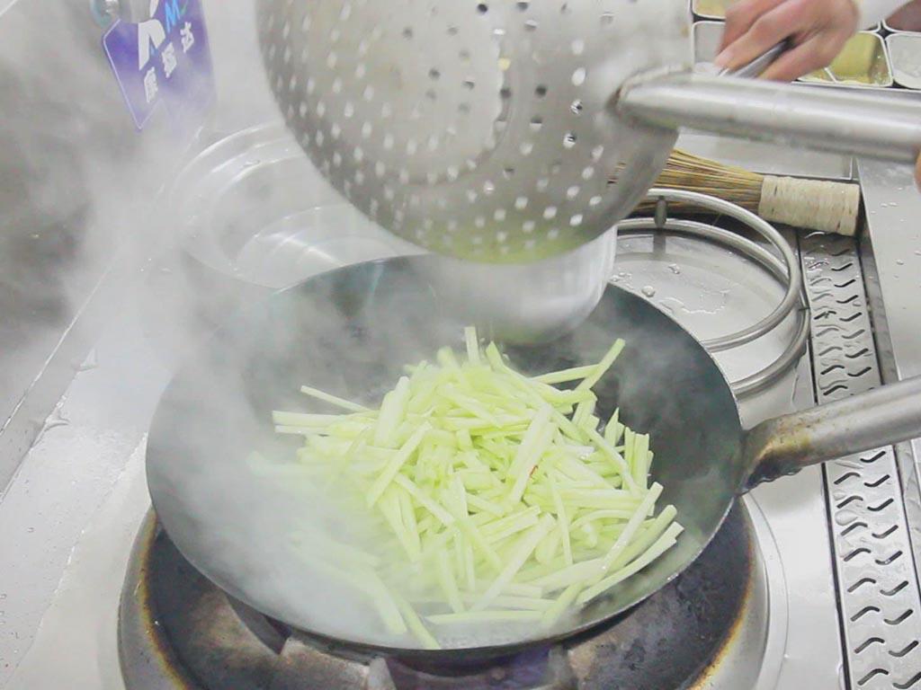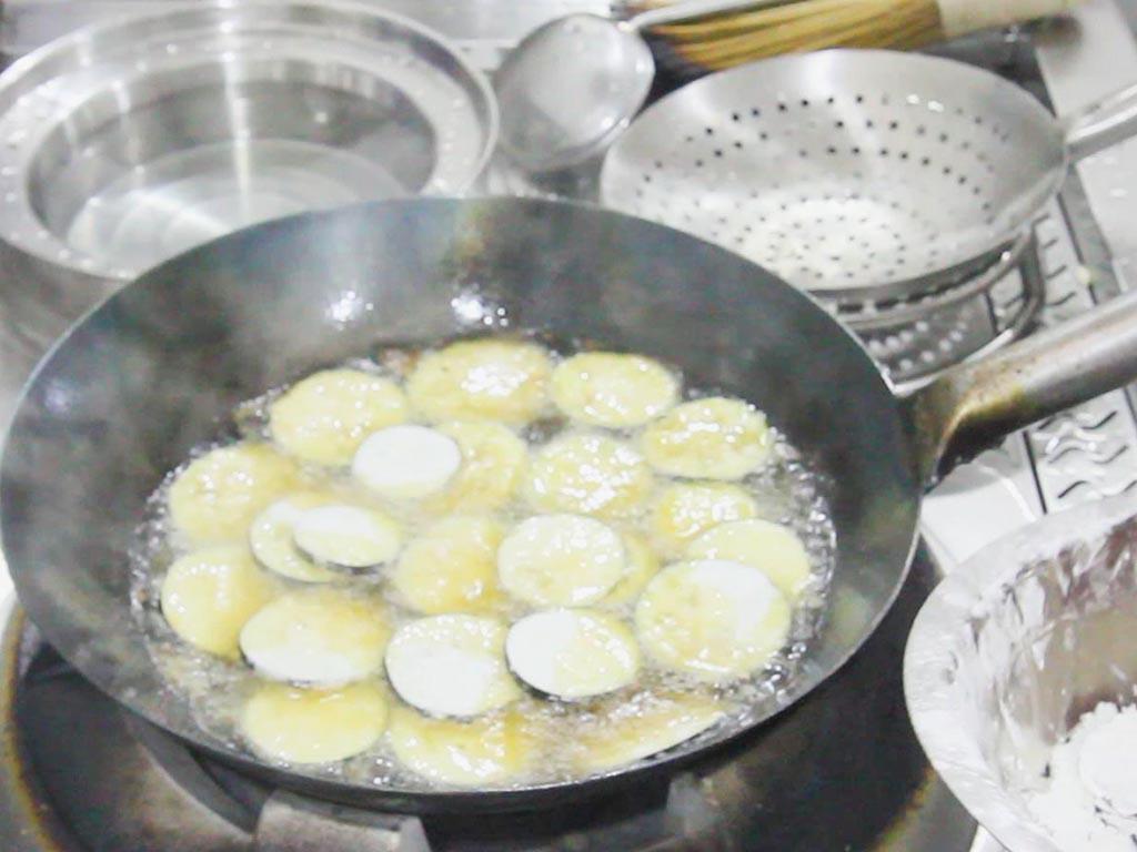 锅内烧油,五成油温下入茄子进行炸制,茄子定型以后再搅动,大约炸1分钟,茄子表面酥黄以后先捞出来,把油温升高至六成热,再次放入茄子复炸一遍,时间不要太久30秒钟即可。