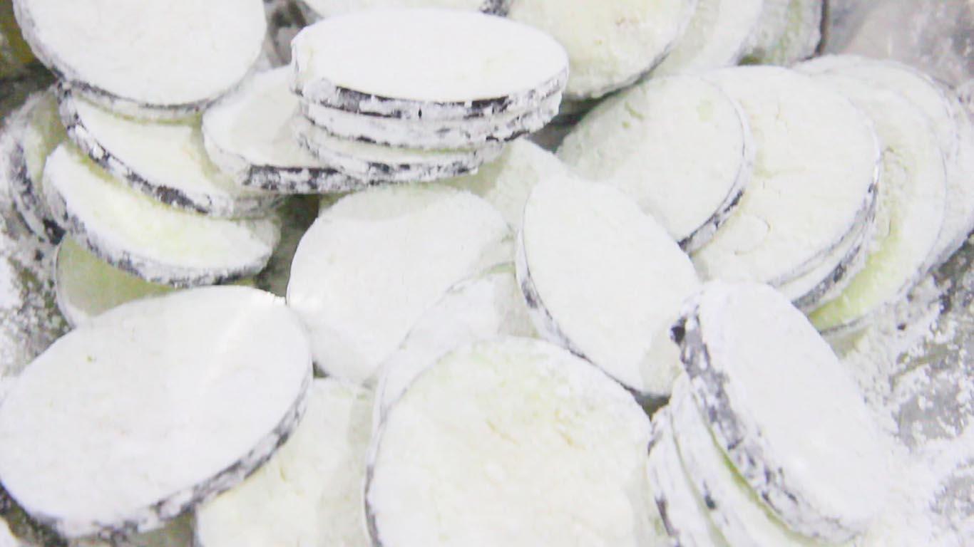 .把浸泡好的茄子捞出来,撒上一把淀粉拌匀。避免吸入过多的油脂,均匀裹满面粉即可,挂完粉以后在茄子上面稍微撒一些清水,防止炸的时候落粉浑油。