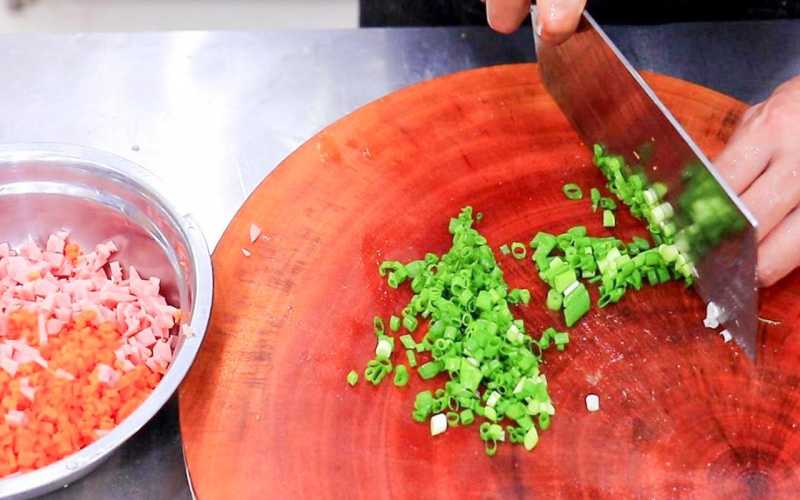 一个胡萝卜削去外皮切成碎粒;一根火腿也切成碎粒;小葱切成葱花,全部放在同一个盆中备用。