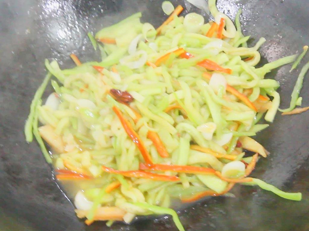 锅内留油,倒入花椒、红干椒炒出香味,再倒入蒜末和葱花爆香以后,倒入茄子和青红椒圈,加入生抽、食盐、鸡精、白糖翻炒化开调料,再撒入香葱段和白芝麻,即可出锅装盘了。