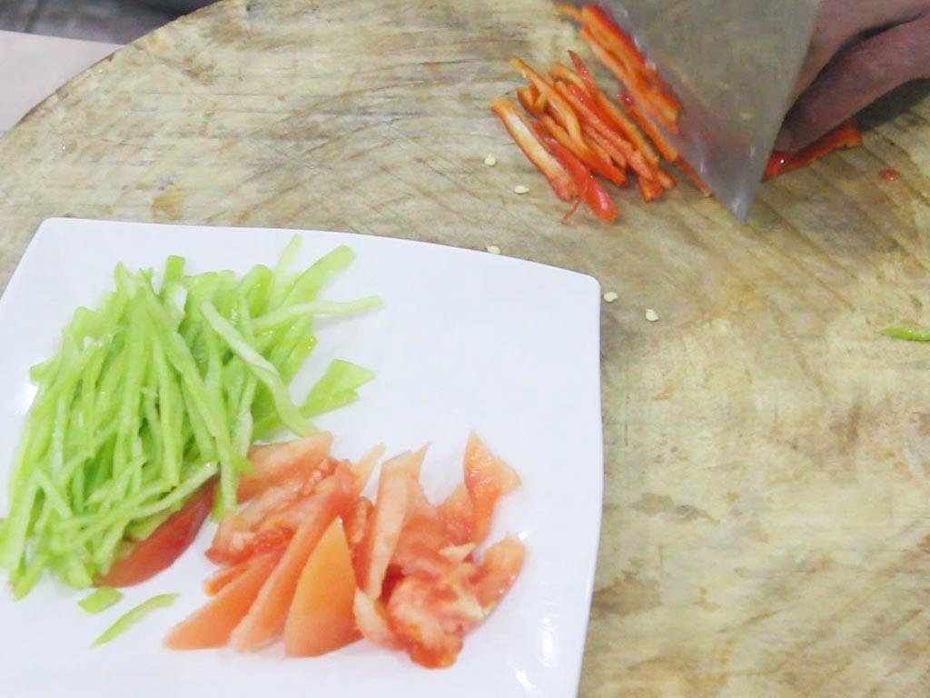 将一个青茄子去蒂削皮切成丝后,泡在水里以免茄子氧化变黑;半个西红柿切成小块;青椒、红椒各一个去籽切成丝装盘备用;三个大蒜切成片,一段葱白切成片放在一起,再抓一小把红干椒。