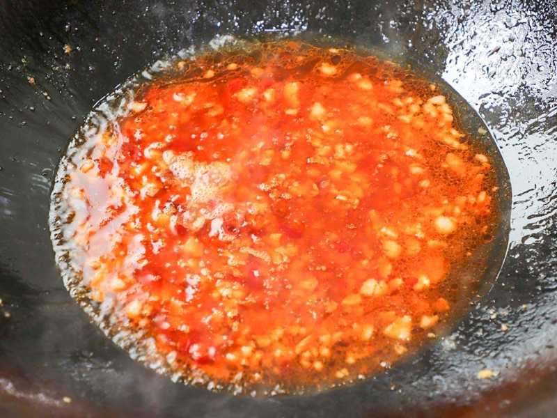 锅内烧油,油热后倒入切好的肉末炒香,然后倒入小料炒出料香味,加入豆瓣酱5克,把豆瓣酱炒散炒出红油,从锅边淋入一勺清水,水烧开以后开始调味。