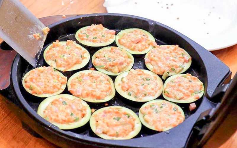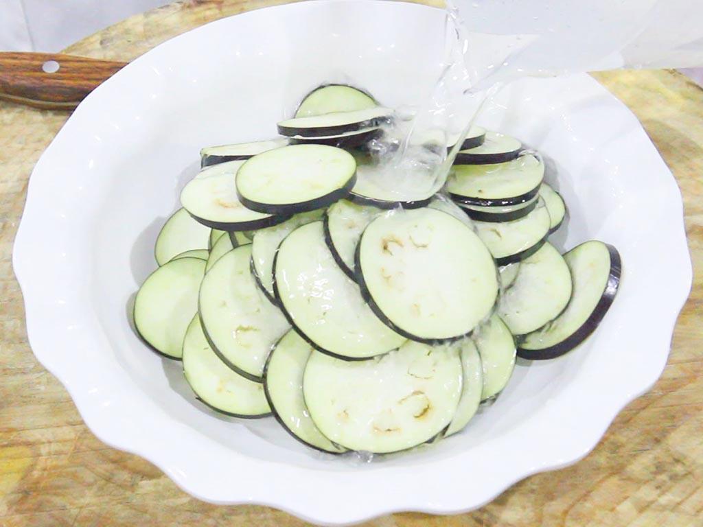 准备两个紫茄子,洗干净以后切成1厘米厚的茄片,然后将茄片逐个挖去内瓤,保留完整的茄子圈,挖出来的内瓤切碎粒和胡萝卜、火腿等放在一起充当馅料,往里面打入三个鸡蛋、一勺食盐、一勺胡椒粉搅散,最后分次加入适量的面粉,调成粘稠的馅料备用。