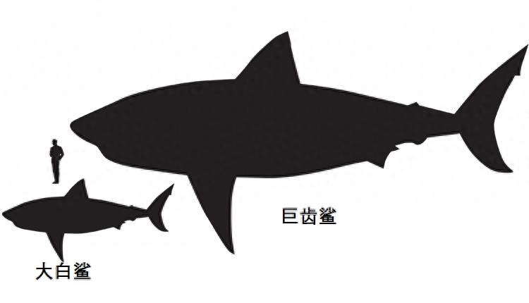 图注:人类、大白鲨、巨齿鲨体型对比