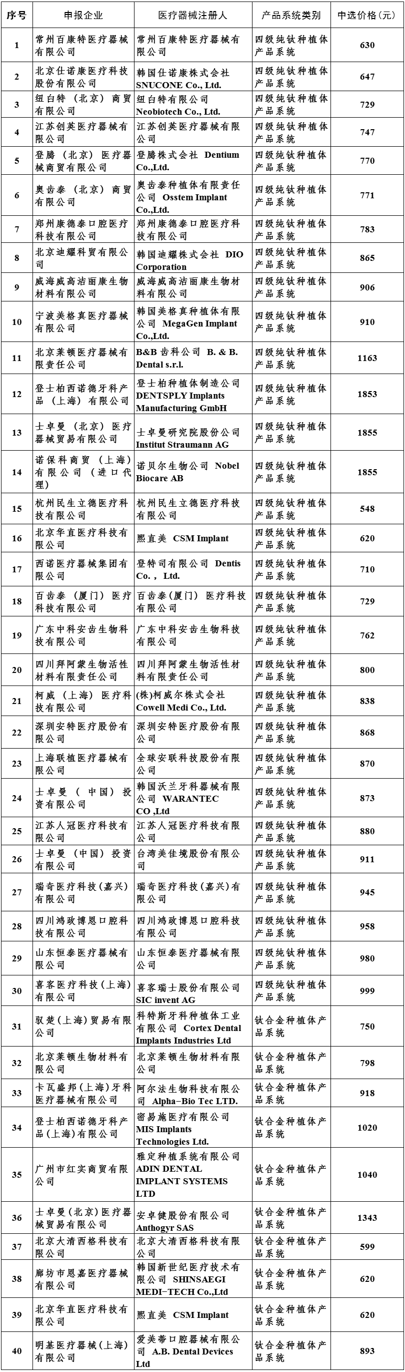 口腔种植体系统省际联盟集中带量采购中选结果简表