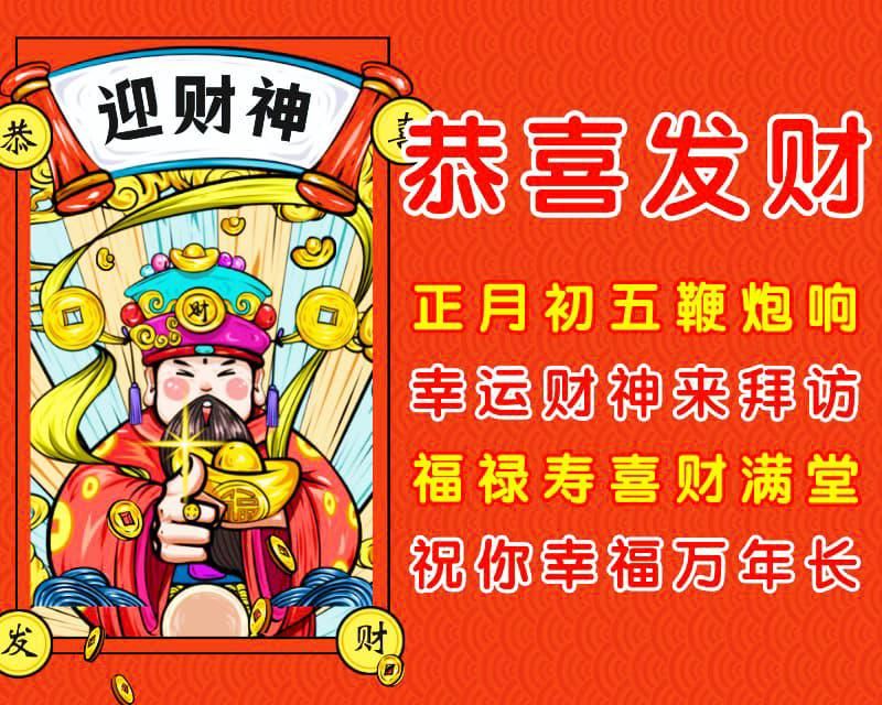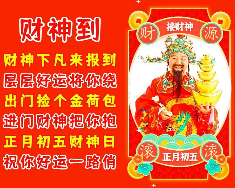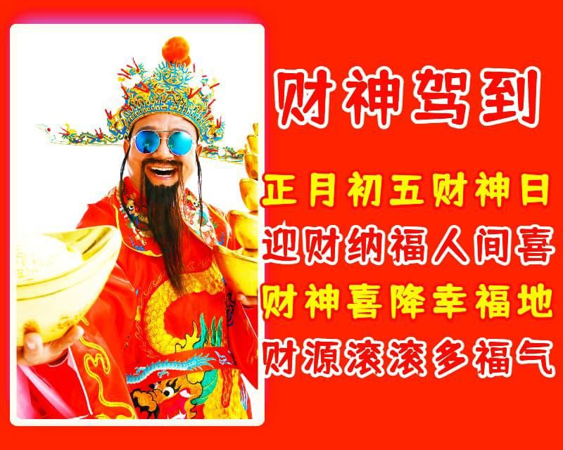 5、正月初五财神日,迎财纳福人间喜,财神喜降幸福地,财源滚滚多福气,财神驾到
