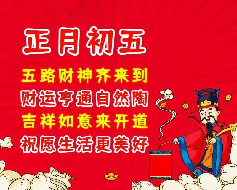 4、五路财神齐来到,财运亨通自然陶,吉祥如意来开道,祝愿生活更美好,正月初五