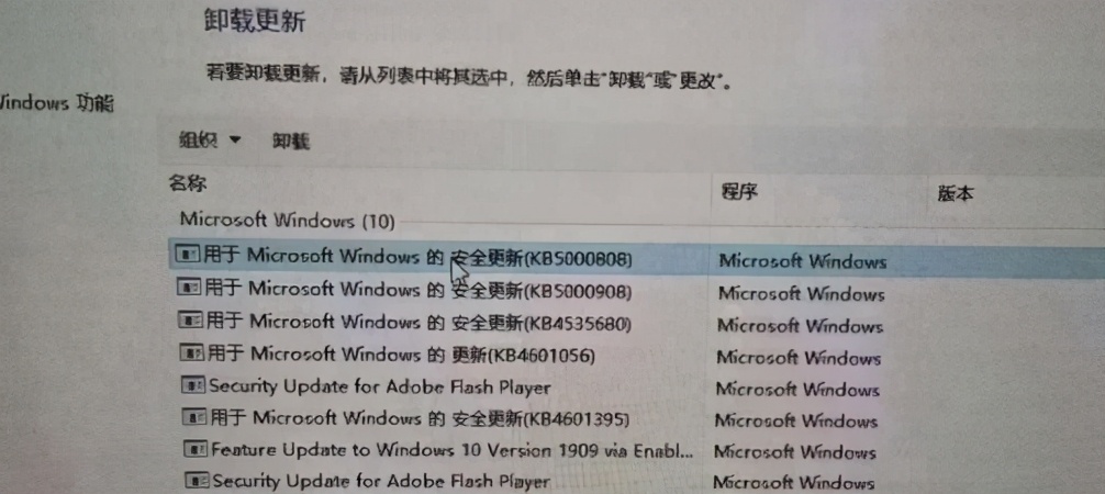 第五步:找到“KB5000802”或者“KB5000808”右击选择卸载,注:(卸载需要等待一会)等待卸载完成后重启电脑打印图片即可恢复正常。