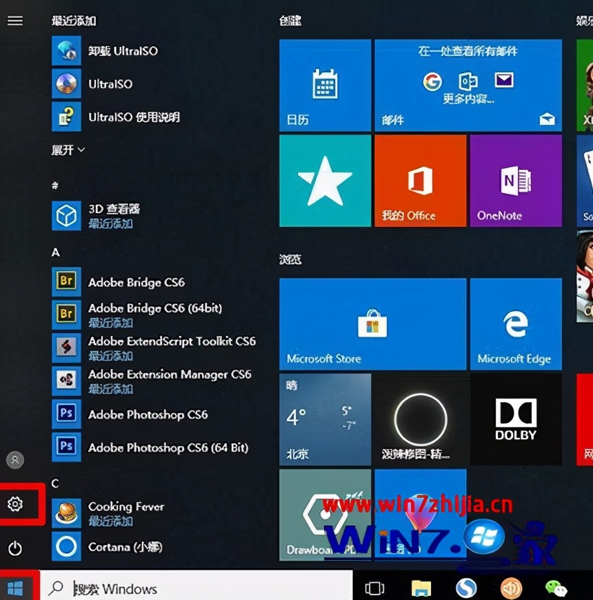 第一步:鼠标左键点击电脑左下角的开始按钮,接着点击上边“齿轮”形状的“设置”按钮