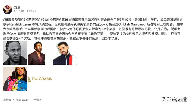 今年一月我在微头条发过几篇关于预测格莱美奖项的短文,侥幸预测结果还算准确,刚好格莱美直播那天我在外地旅游,没来得及写专题文章,获奖名单大家应该都看过了。