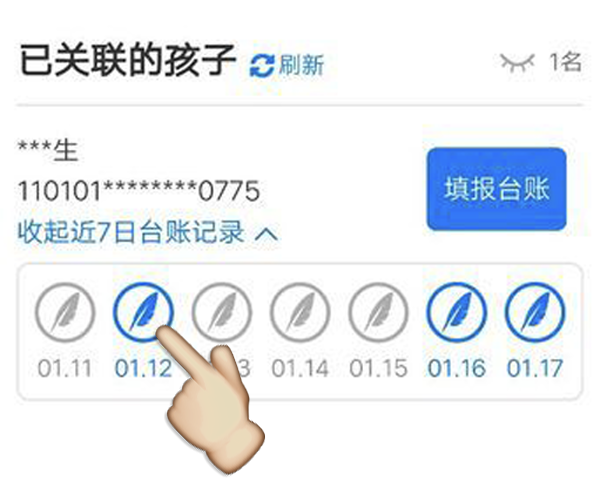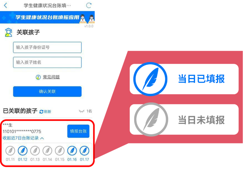 按钮。关联后可显示已关联的孩子信息,点击“小眼睛”图标可查看完整姓名及证件号。