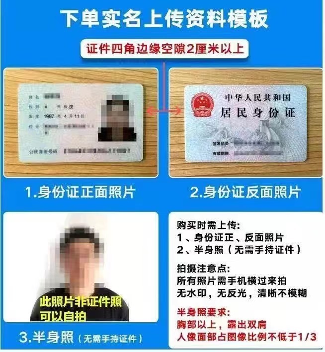 ②下单需上传身份证正反面照片和上半身照片,下单界面有具体要求,如上传照片不合格,后台审核不通过,会向联系电话发送补传链接短信,需重新上传,审核通过方可开卡。