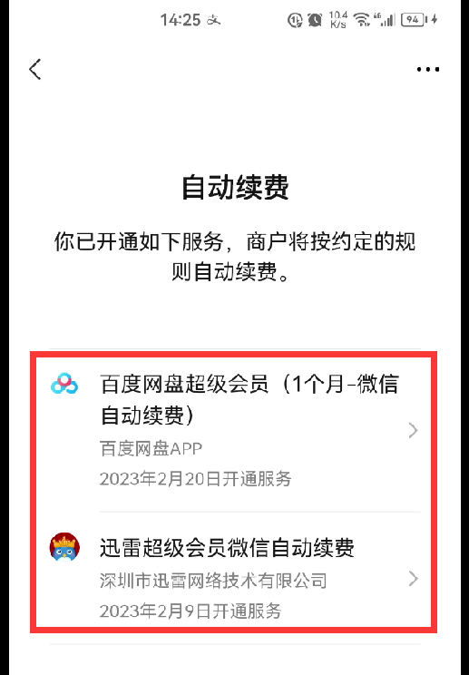 在自动续费界面,我们就可以看到有哪些软件在通过微信自动续费。大家可以看到,我的微信里有2个软件在自动续费,一个是网盘超级会员,一个是迅雷超级会员。比方说:不想让网盘下个月继续自动续费的话,就点击它。