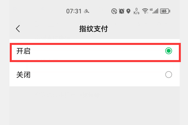 然后选择“开启”选项,验证我们自己的指纹,然后就可以开通指纹支付了。以后再出门购物消费的时候,通过微信支付的时候,就不需要再输入支付密码,只需要验证一下指纹就可以了。