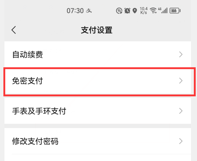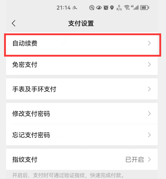 在支付设置界面有一个“自动续费”选项,点击进去。