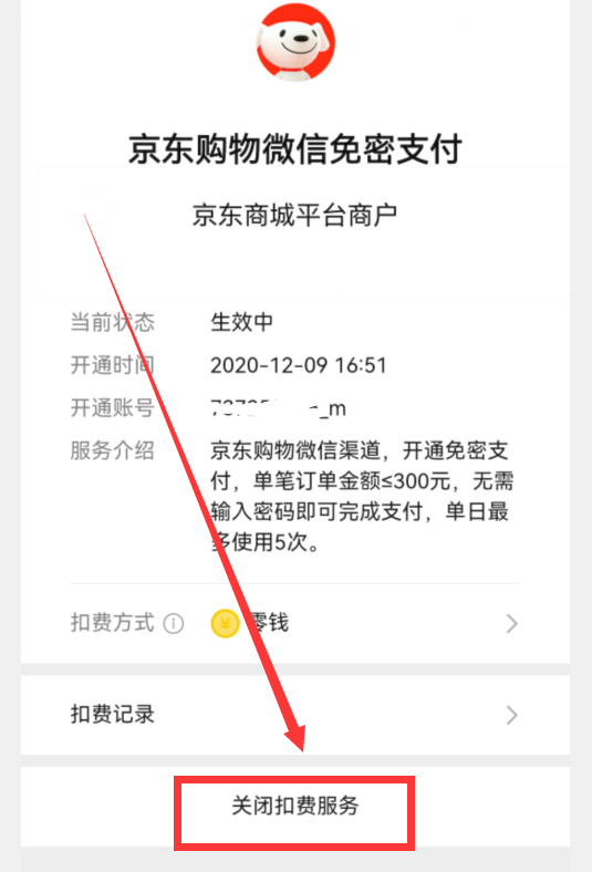然后点击“关闭扣费服务”就可以了。以后,在京东商城上购物时,通过微信支付的时候,就需要验证我们的指纹和支付密码了,这样更加安全。