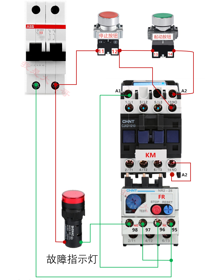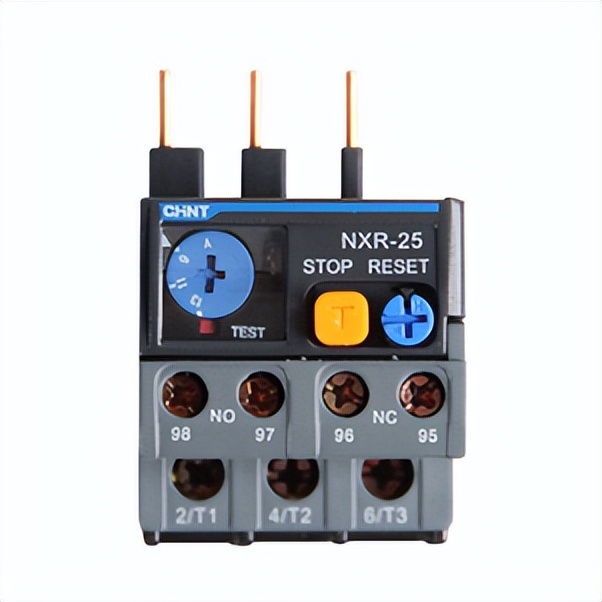 热继电器有一组常闭触点95和96,一组常开触点97和98。常闭触点串联控制线路,一般串接交流接触器的线圈,当电机过载时热继跳闸,常闭触点95和96断开,交流接触器线圈失电,电机停止运行。常开触点可以接报警或故障指示,也可以不接。