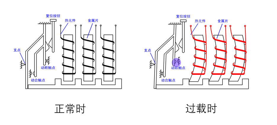 热过载继电器又叫热继电器,型号和样式有多种,有的热继电器有缺相保护、三相电流不平衡保护。当电机工作时,出现过载或故障,导致工作电流急速增大,热继电器的热元件急速发热,温度越高,双金属片弯曲越明显。弯曲的双金属片推动动作机构动作,常闭触点断开常开触点闭合,过载电流越大,动作时间越快,从而保护电机不被烧坏。
