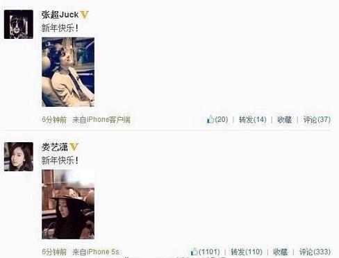 证据之一是两人在2014年同时发布了一条新年快乐的微博~