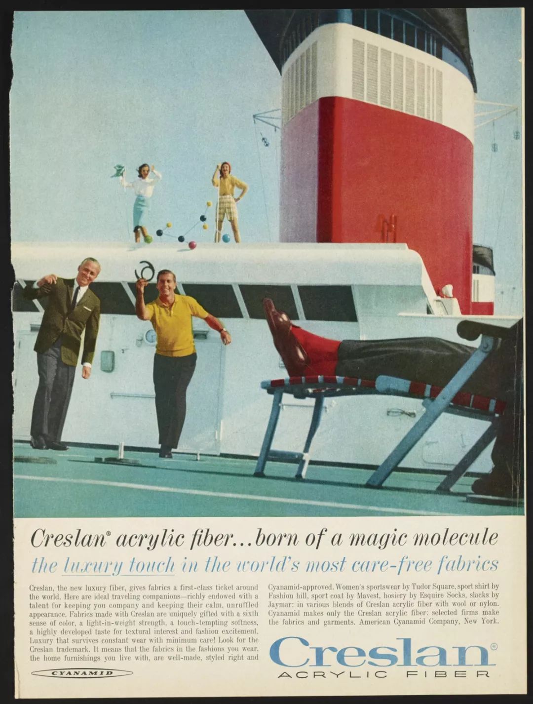 像聚酯纤维一样,它在上世纪50年代开始被广泛应用于服装领域,作为可机洗、适合运动着用的衣物面料,但现在更常见于低质量毛衣中。