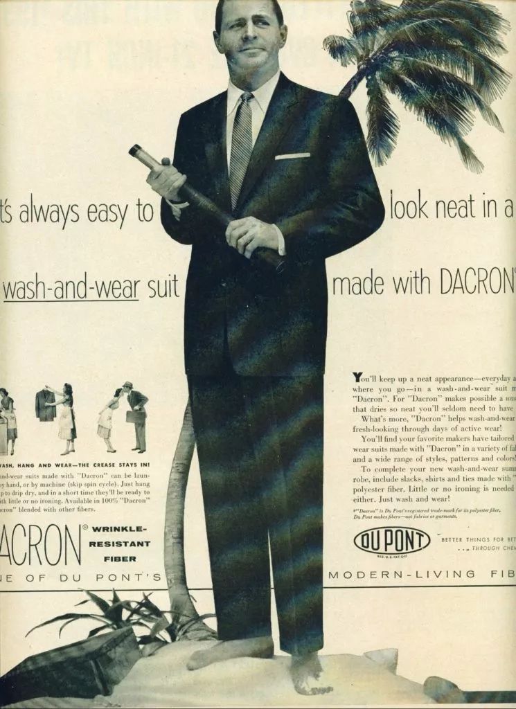 有别于其它合成面料,涤纶面料能够推广到家喻户晓,杜邦是功不可没。当时他们推出了运用这种纤维制成的西装,让人连续 67 天穿着着它,而且过程中没有经过任何熨烫。