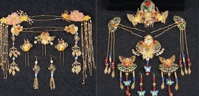 还有唐朝当时头上所戴的钗,簪等类,它们靠金银打造,例如钗朵,一式两件,是对称戴的,类似这样的镂花图案最为常见。也许我们从白居易的诗“云鬓花颜金步摇”认为当时女子的头钗有多么华丽,但实际情况不是这样,它虽有华丽之处, 但并不是常常可以戴出去,它有特定的时间,特定的场合。所以我们在电视剧中,或者一些其他的小说文章中所了解到的唐朝女子常常可以带着满头的珠钗并不是事实。