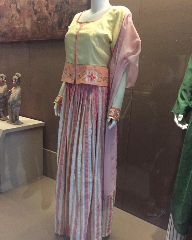 在唐朝服饰中值得说说的还是女子的。女子常见的有齐胸衫裙式,半臂高腰裙式。齐胸衫裙由襦衫,长裙,披帛这三部分组成。其中襦衫也被分为六类:对襟直领,右衽交领、方形坦领、深U坦领、心型套头、V领套头,袖子也在发展过程中由窄袖逐渐变为宽大。因其款式的不同,所以人们穿出的效果与感觉也是不同的。高腰襦裙和齐胸衫裙本质上是没有太大差别,重点在于所穿形式不同,齐胸,顾名思义,就是将长裙束于胸部之上;高腰就是将长裙束于胸部以下腰部之上。裙子上的花纹较多,色彩也是鲜艳,明快。常会以刺绣,印花,暗纹等形式作为长裙的装饰,且长裙的颜色多为红色。