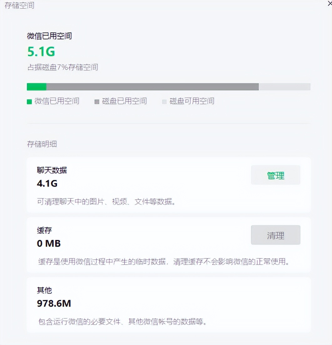 首先,展示微信用了几个G,占用了电脑磁盘多少空间。