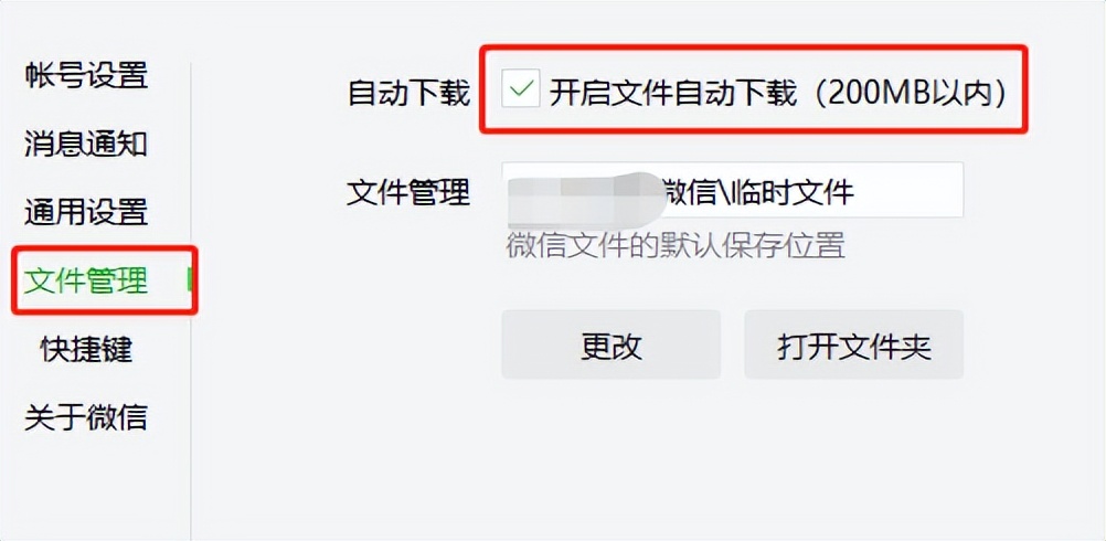 自动下载选项中,更新后多了行说明:200MB以内的文件,会自动下载。
