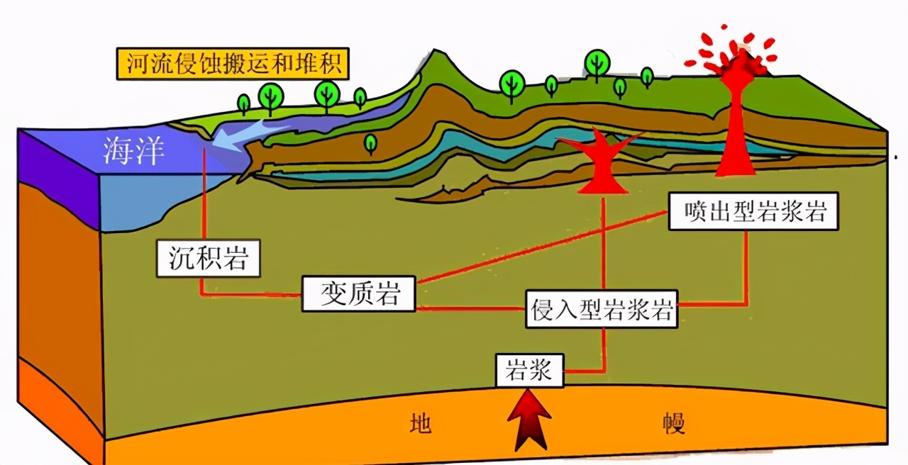 :地表岩石在外力的作用下(风化、侵蚀),被破坏成碎屑物质,并被搬运到地势较低处沉积、固结,最终形成岩石(例如石灰岩、砂岩、页岩)。