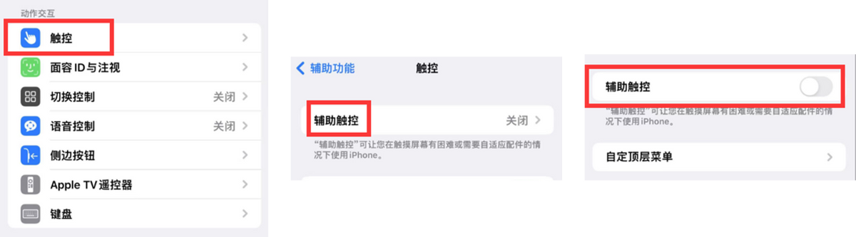 接着我们在【辅助功能】,找到【触控】选项,点击进入后,将【辅助触控】功能打开。打开后,你就会发现苹果手机的“小圆点”已经出现在屏幕上了。