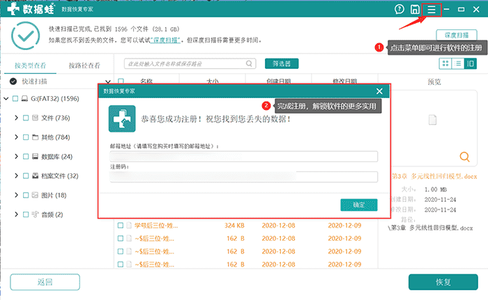 第三步:找到目标文件后,单击右下角的还原。还原到文件丢失的位置,会导致文件丢失的再次发生,把文件存储在另外的存储设备或者其他的分区是一个不错的选择。欢迎你注册数据蛙数据恢复专家软件,恢复更多文件。