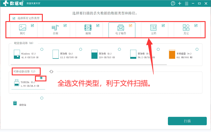 第一步:在浏览器上搜索数据蛙数据恢复专家软件的官网(https://www.shujuwa.net/shujuhuifu/),进入官网后进行软件的下载和安装,在这里要注意不要把软件安装在误删文件所在的磁盘或者存储设备中,这样也会导致数据的覆盖。打开程序后,选择丢失文件所在的位置和类型,就可以进入扫描了。