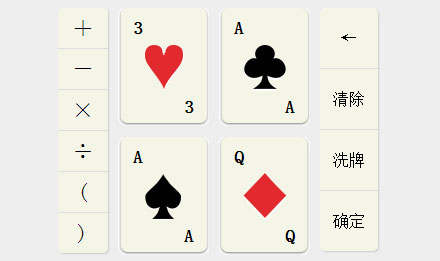 24点算法是把4张扑克牌牌面的数字通过加减乘除(包括括号)进行四则运算,使计算结果等于24的一个棋牌数学休闲益智小游戏。这个小游戏能锻炼人的快速反应能力,除了平时的休闲消遣之外,还经常被很多老师用于数学课堂教学或是数学周的小比赛中,因为这能极大地调动学生多种感官的协调能力也非常利于培养学生的心算能力。