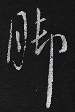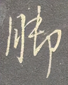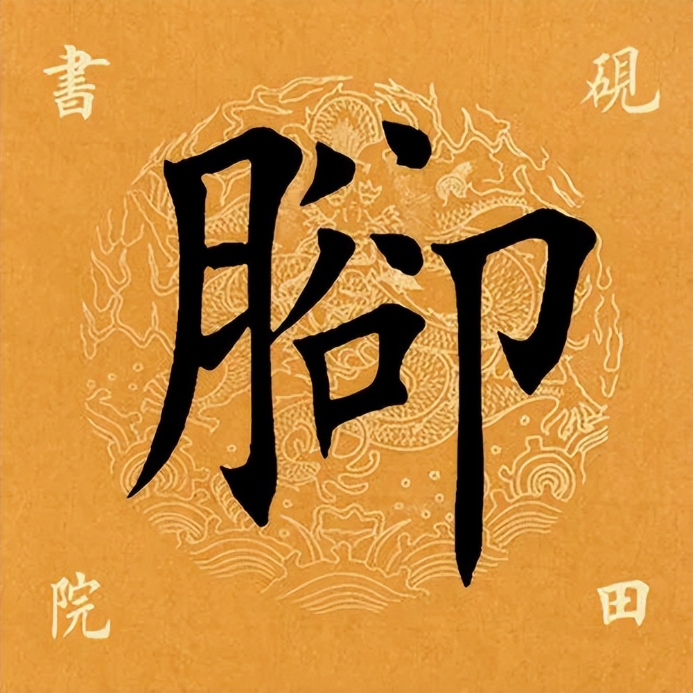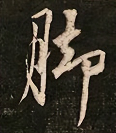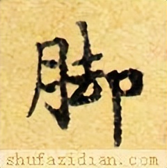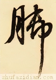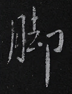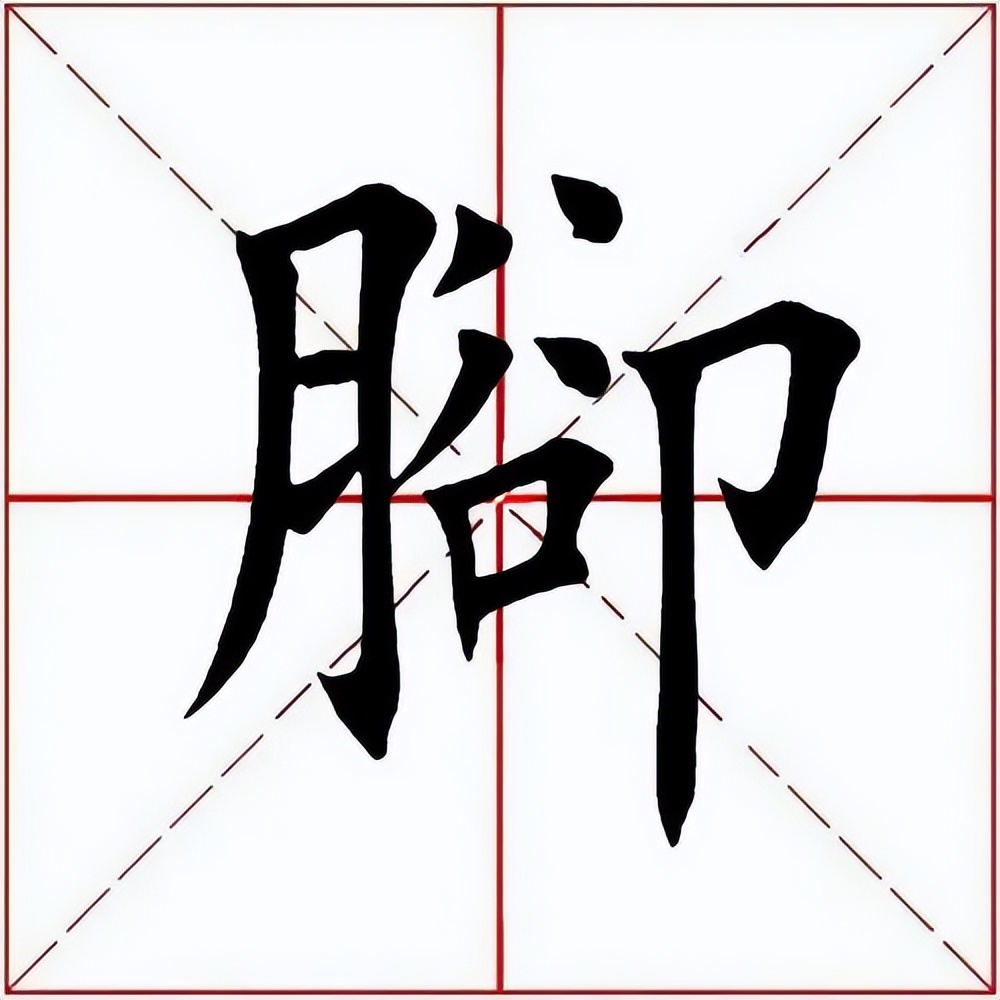 左部“月”旁斜势抗肩,不要写宽。首笔竖撇稍抖起笔,竖稍左斜,约到三分之二处稍给力出撇肚、稍拐撇出;横折竖钩半虚接起笔,横画大抗肩,勿重,勿长,然后稍重顿笔、稍内擫写竖,竖身稍弯,到位后跪笔弹锋起钩,注意指向;两小横写成点、提,相互呼应,稍偏上。