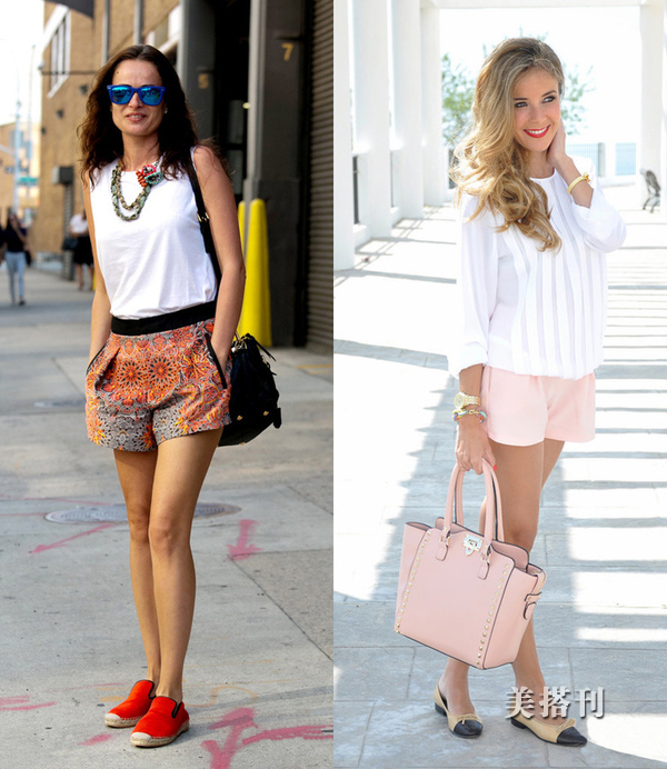 小白鞋作为百搭的单品不可不提,休闲不过时的小白鞋搭配上热短裤,非常青春减龄,想要大长腿的话,最好要选择左边的超短裤,向右边的款式虽然时髦,但只适合于高个子穿着,小个子穿会显得有些矮。