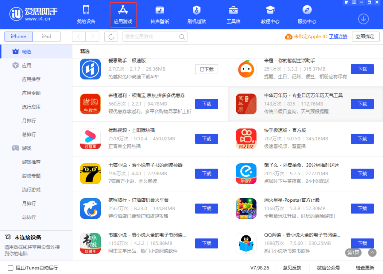 使用爱思助手 PC 端或移动端,不需要登录 Apple ID,也不需要密码,即可免费下载海量应用。