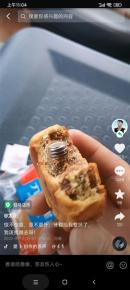 一段网络视频显示,一块被咬了小半的月饼中,露出一截长约1厘米长的螺丝,螺丝的其他部分被包裹在月饼中,螺丝的尾部也露了出来;月饼的包装袋显示这是一块“精品枣蓉月饼”,包装袋还显示了月饼的品牌、****等信息。