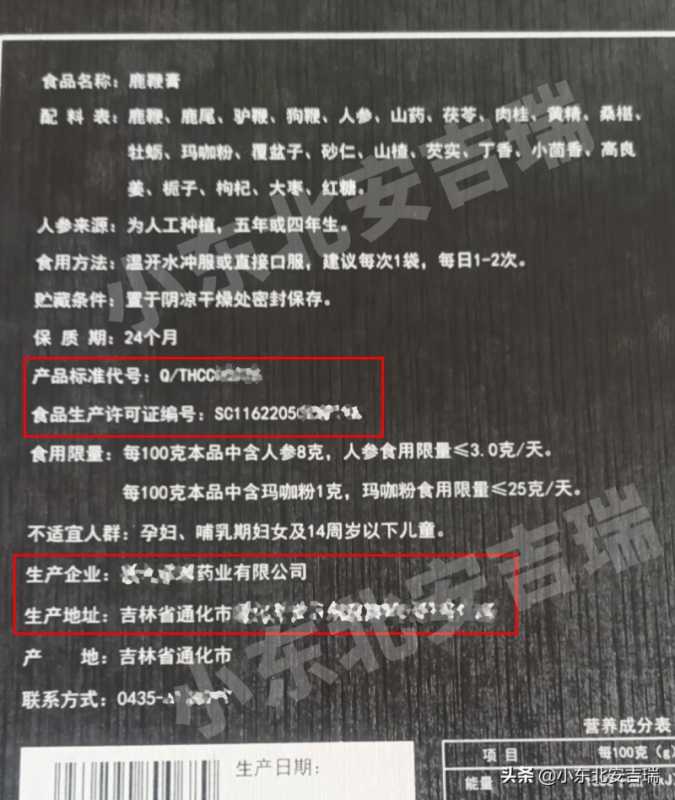 大家在买这类产品的时候一定要看看包装上有没有生产批号、生产企业等等信息,如下图(就拿我们当地一家药厂生产的鹿鞭膏举例,厂商已打码)