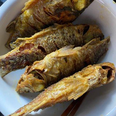 8、这是4只鱼炸好的样子,到这步骤就可以沾点辣椒面吃,脆香脆香的。
