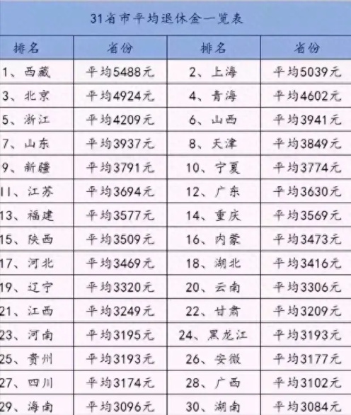首先,从这张表格的数据来看,西藏、上海、北京、青海和浙江的退休人员平均养老金排名前五。其中,西藏的人均养老金达到了5488元,位居全国之首。这主要是因为西藏的工资构成中,除了基本工资以外,还有西藏特贴。在西藏的机关事业单位工作人员退休的,养老金在万元左右的比较普遍。这是符合实际情形的。