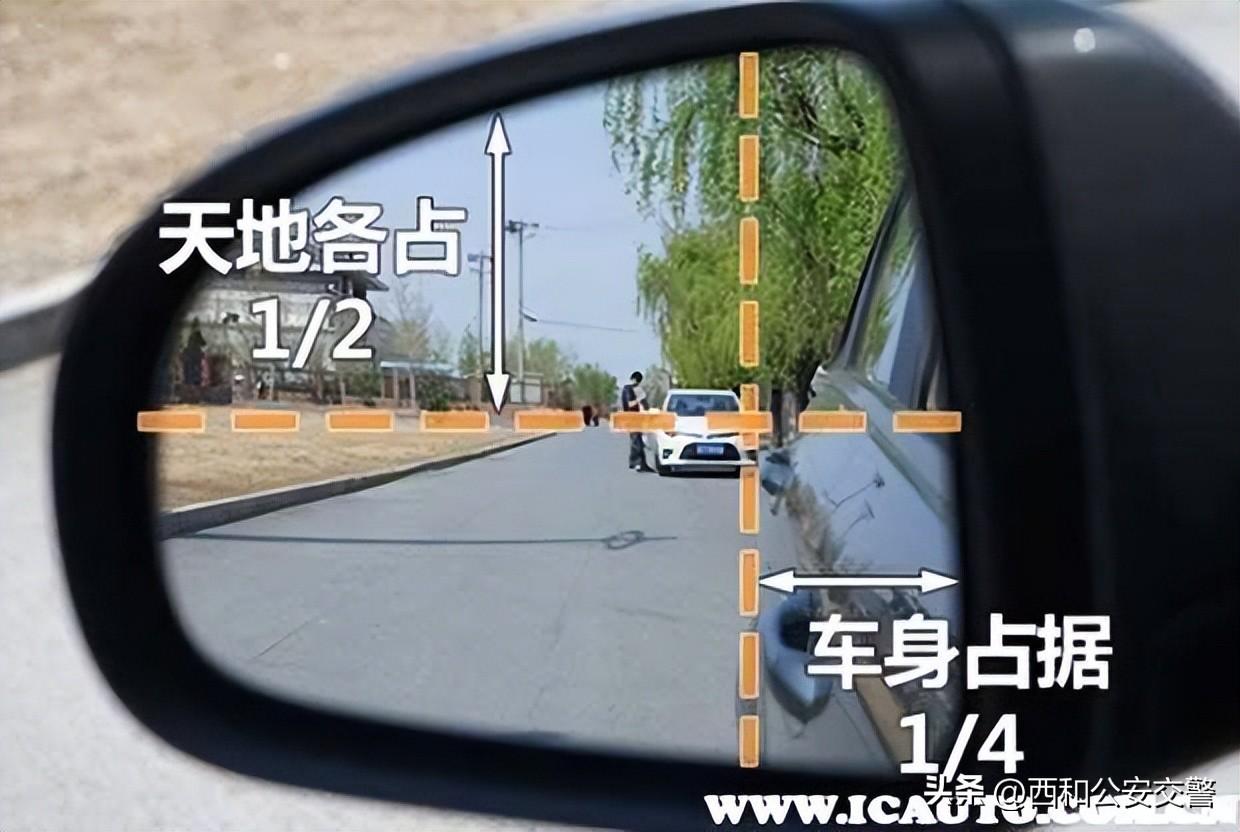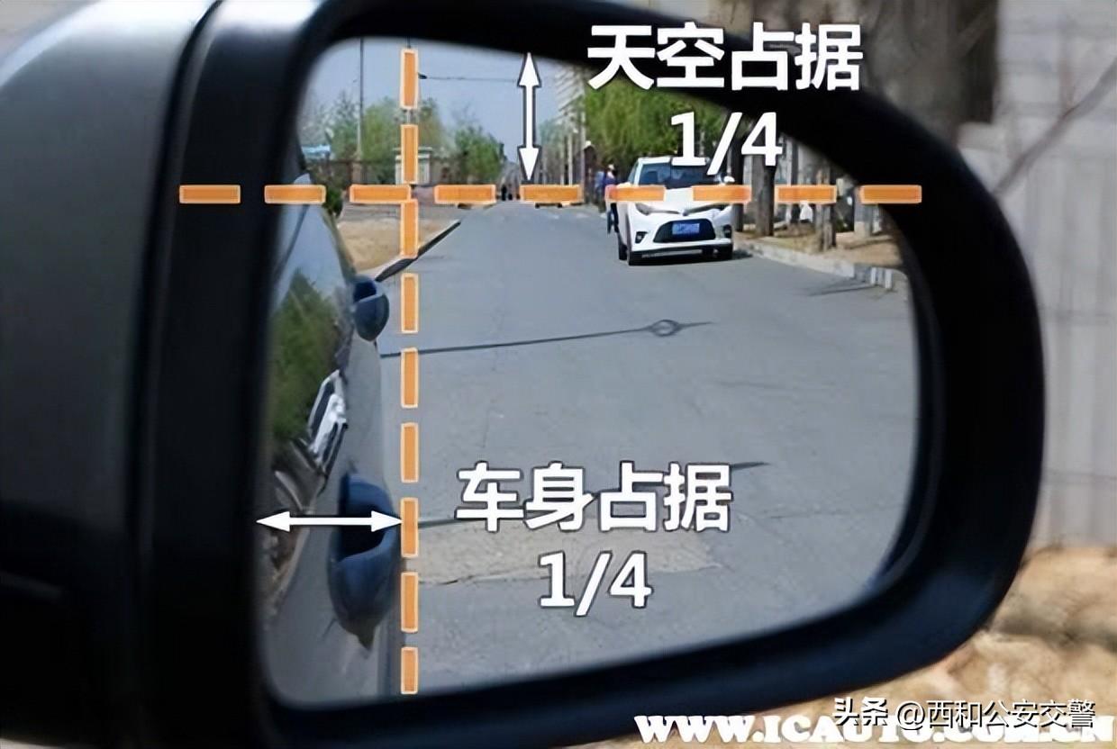 1、左右后视镜的调整方法略有差异,首先调整右后视镜,要确保镜子的最上方能看到后车门把手,同时保证前车门把手在镜子中间,要注意的是车身占倒车镜面积的1/4,原则上越少越好,不过太少的话会导致地面的线与左边镜子看的不一样宽,所以这个要自己去感受。