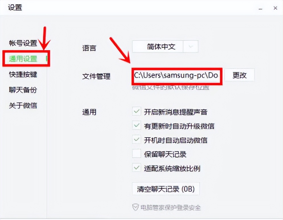 第四步:点击【通用设置】,在【文件管理】处的地址就是聊天记录的保存路径,点击复制。