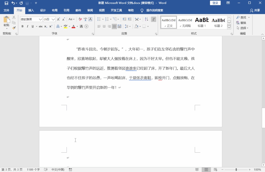 当空白页在文档的中间,就有些麻烦了,这时候不要一直按删除键。将光标移动到空白页上方的最后一个字后面,然后按住【Shift】选中整个空白页,最后按下【Delete】,这样空白页就被删除了。