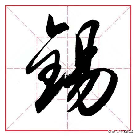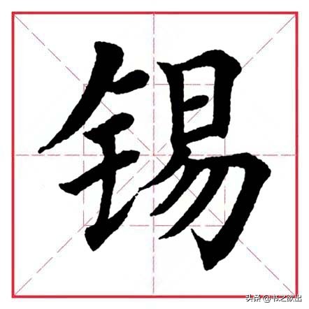 左边“金”字整体斜势抗肩,不要写宽,位置靠上。首撇斜切落笔,稍重,撇身稍直;右边点笔勿重,角度略平,注意位置;下面部分整体偏左,两个横画抗肩平行,上短下长,左伸右收;竖画与首撇的起笔处对应,上重下轻;左右两个点笔左低右高,互相呼应,注意各自的形态;下横起笔左探,抗肩与上面横画一致,右部勿长。