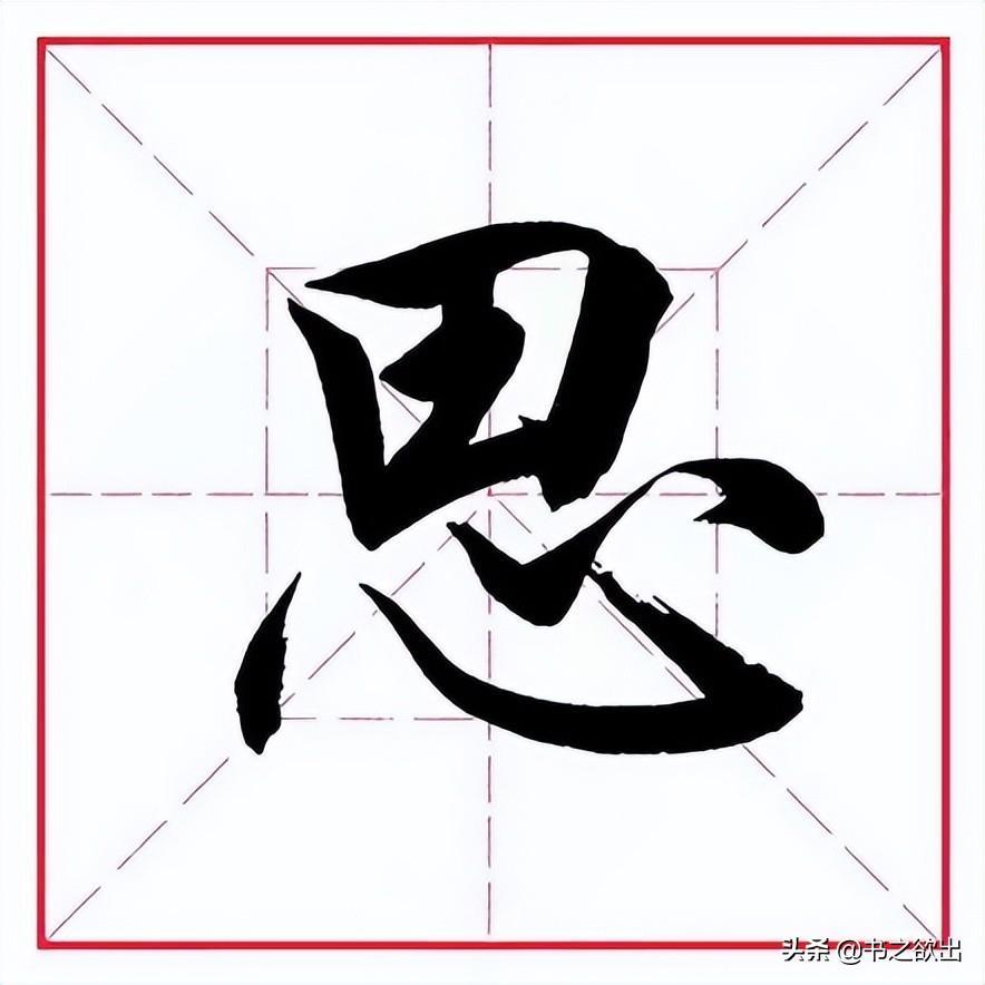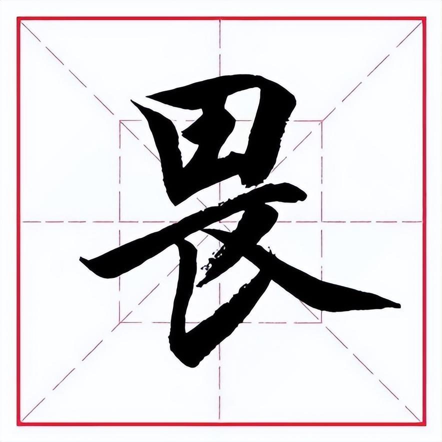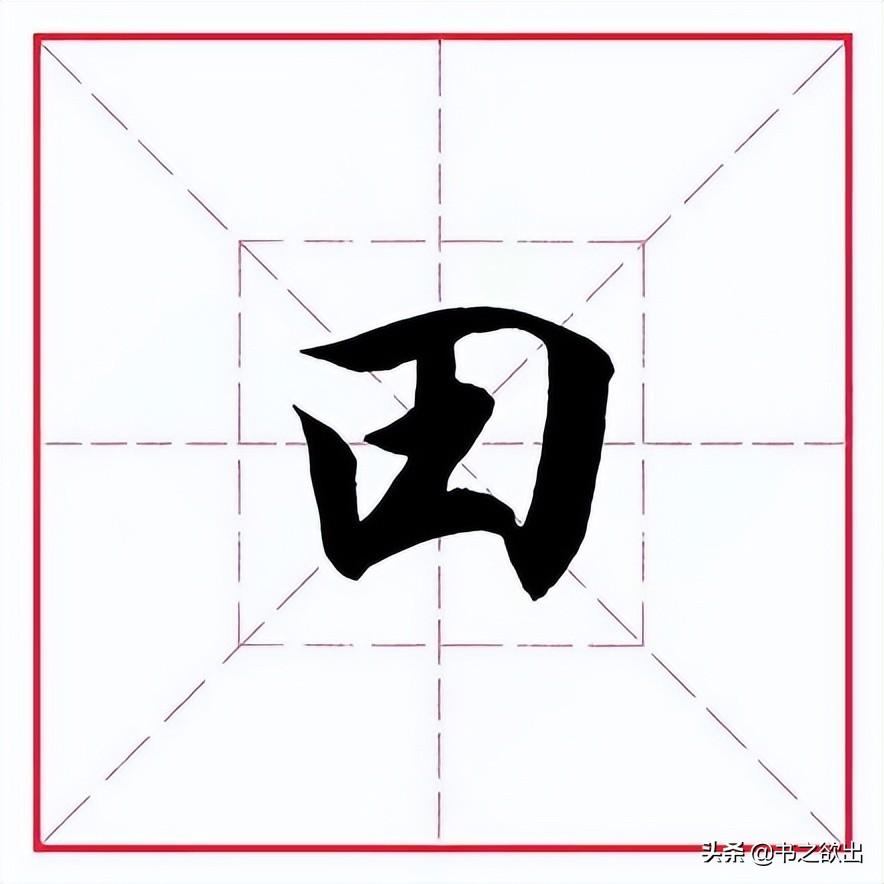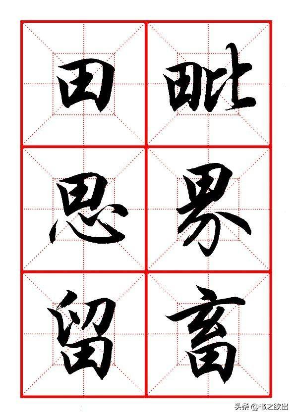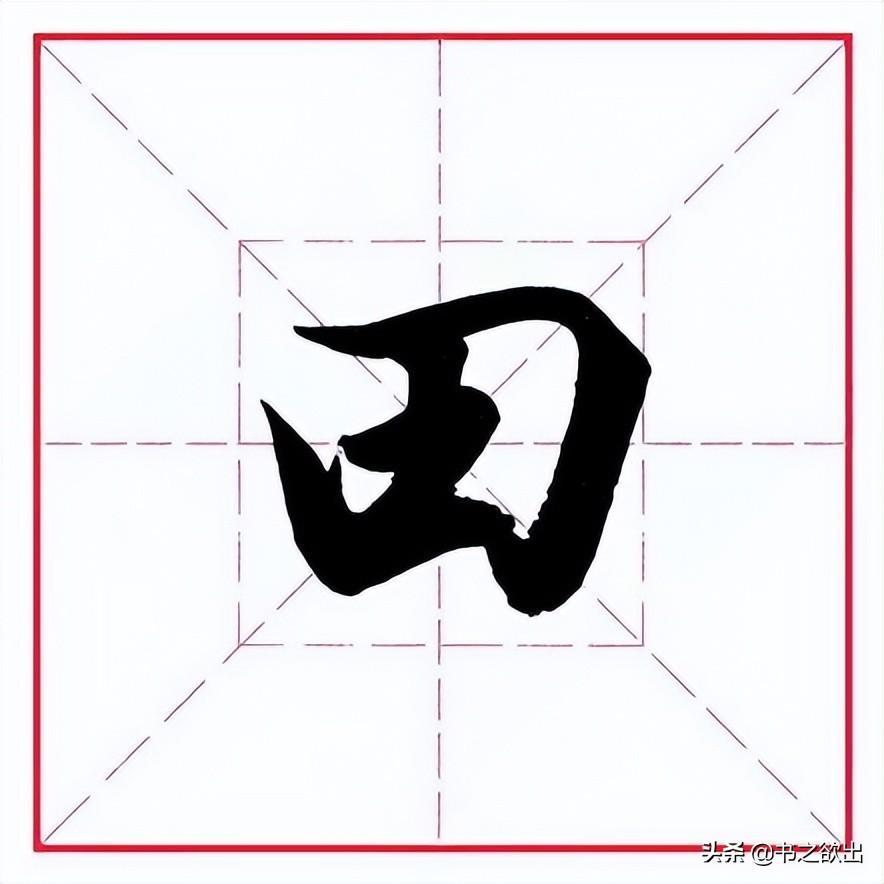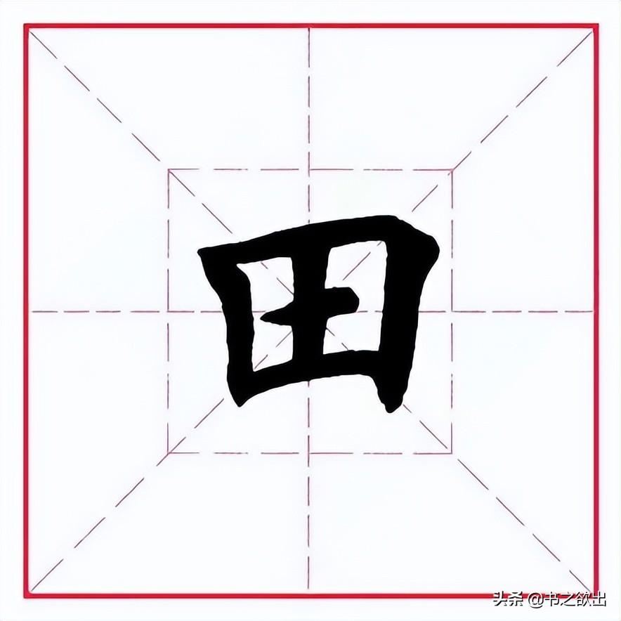 不管是楷书、行书,还是在具体应用中,“田”字形体都应呈上宽下窄之态。在字中居上时整体斜势抗肩,底横左探,不要写大;居下时宽扁平正,以托上部;居左时则紧凑收敛,切忌写宽。
