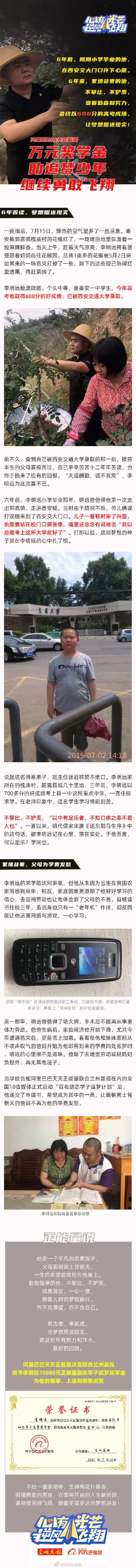 【有志者事竟成!甘肃励志男孩如愿考上西安交大,6年前曾在校门口留影】近日,甘肃天水,秦安一中学子李明远以608分的优异成绩,被@西安交通大学 录取。6年前,刚刚小学毕业的他,曾在西安交大校门口留影并许下心愿,“我以后能考上这所大学就好了”。6年来,家境贫寒的他,不攀比、不妒羡,靠着勤奋和努力,终让梦想成真!天天正能量 百名励志学子追梦计划送上万元奖学金,为勇敢追梦的男孩点赞加油!
